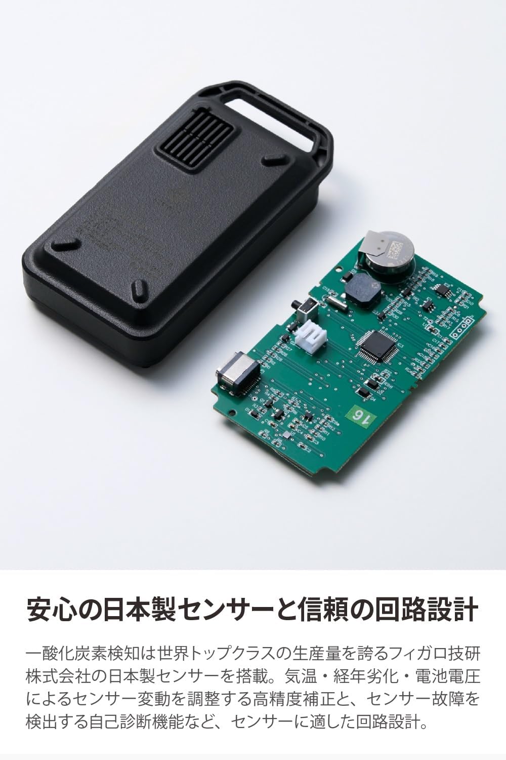 本製品はフィガロ技研株式会社の日本製センサーを採用し、一酸化炭素を高精度で検知。さらに、温度計と湿度計も搭載しており、テント内や車中泊の際に空気の状態をリアルタイムで把握できます。